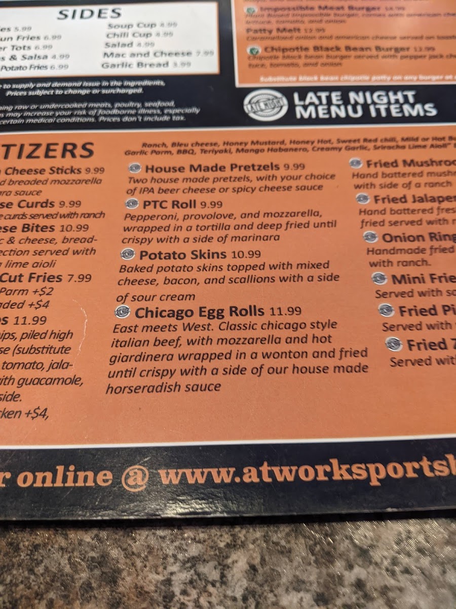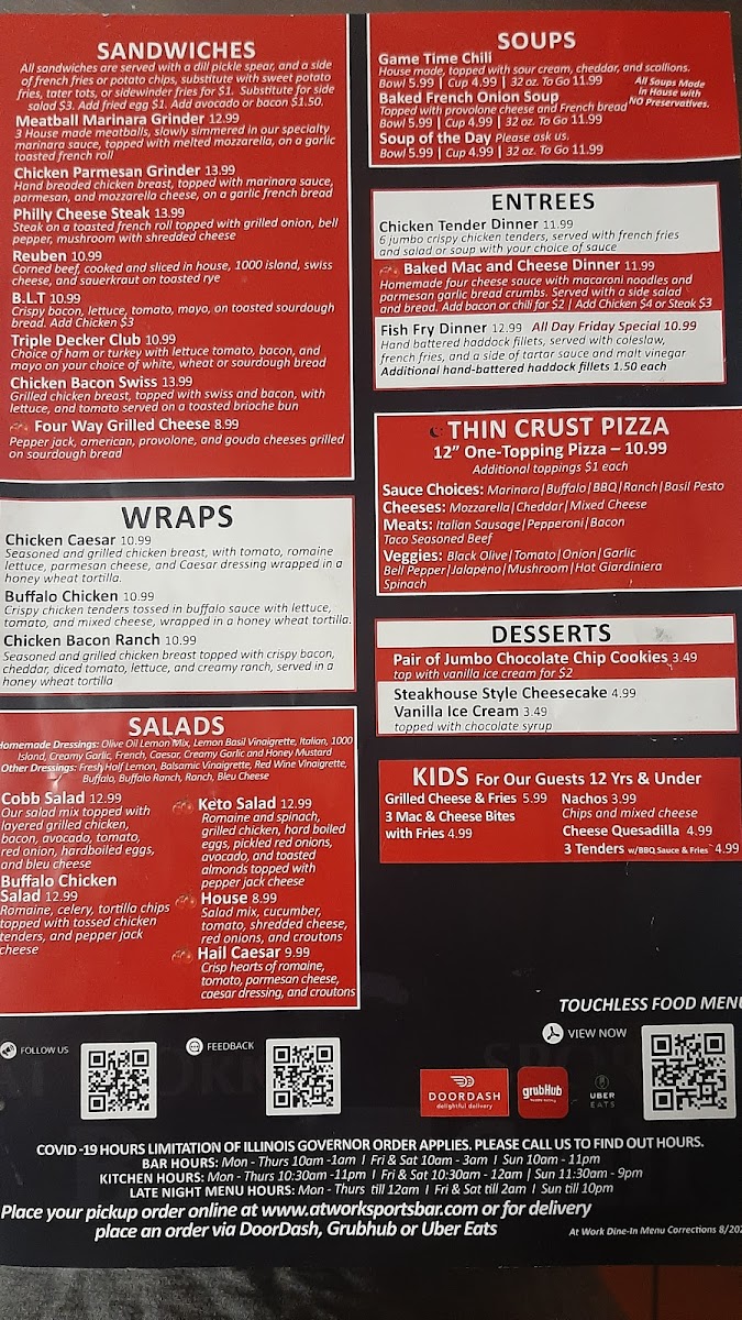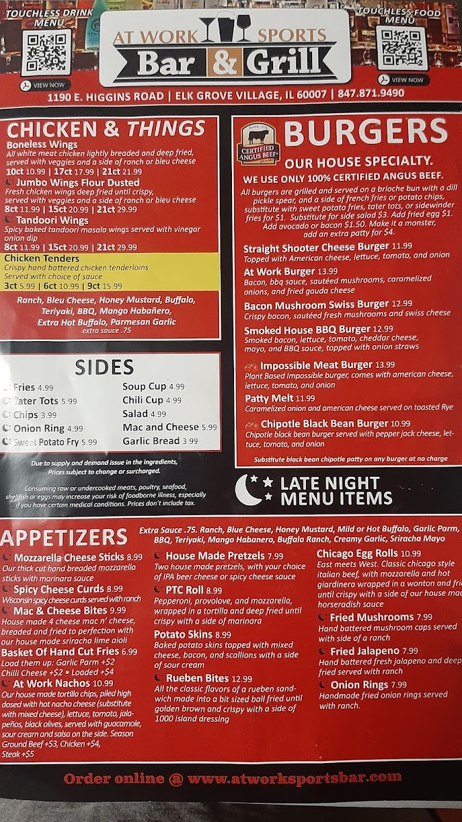 Welcome to At Work Sports Bar, your go-to destination for great food, drinks, and entertainment in Elk Grove Village. Located at 1190 E Higgins Rd, this lively sports bar is a perfect blend of relaxation and fun, offering a menu that tantalizes the taste buds.